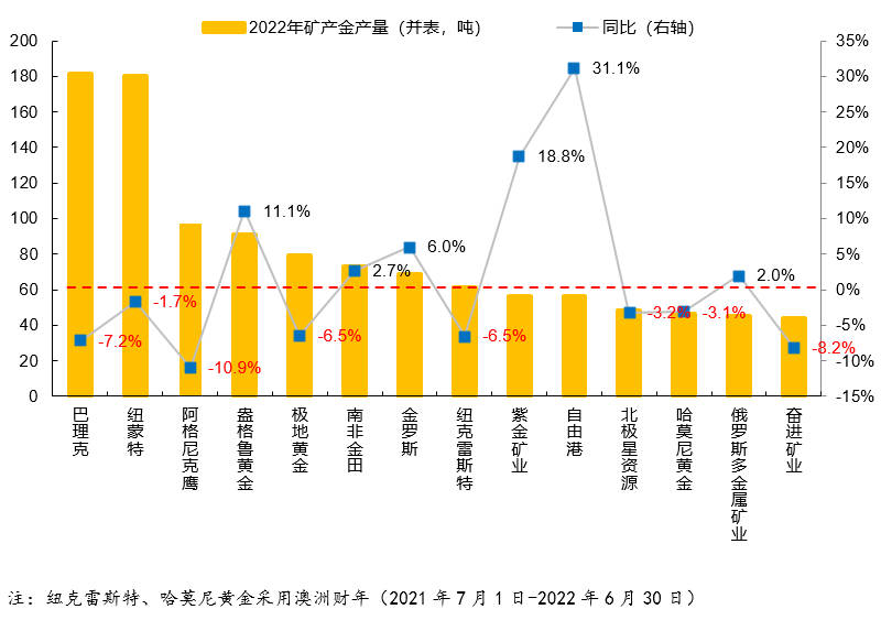 ͼ±í9£º2022ÄêÈ«Çò»Æ½ðÁúÍ·ÆóÒµ¿ó²ú½ð²úÁ¿