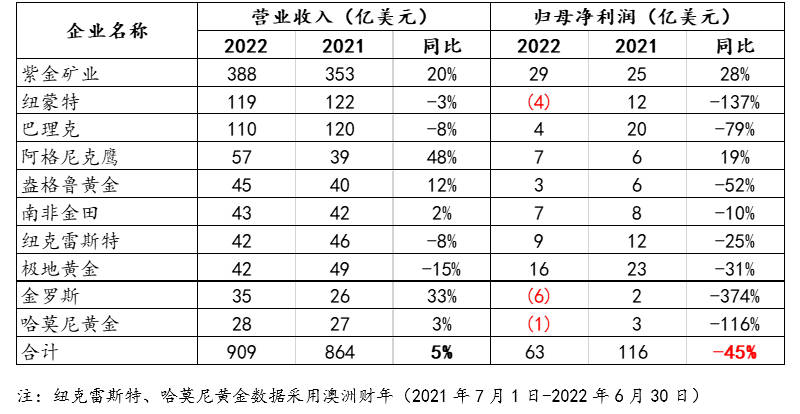 ͼ±í7£ºÈ«ÇòÍ·²¿»Æ½ðÆóÒµ2022ÄêÓªÒµÊÕÈë¡¢¹éĸ¾»ÀûÈóÇéÐÎ