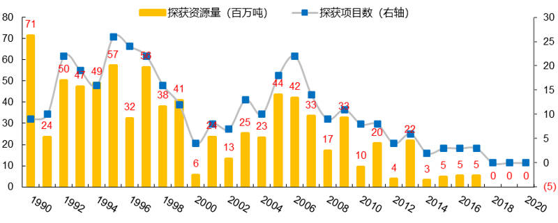 ͼ±í10£º1990-2020ÄêÈ«Çò»Æ½ð̽»ñÏîÄ¿ÊýºÍ̽»ñ×ÊÔ´Á¿£¨×ÊÁÏȪԴ£º±êÆÕ²ÆÖÇ£©