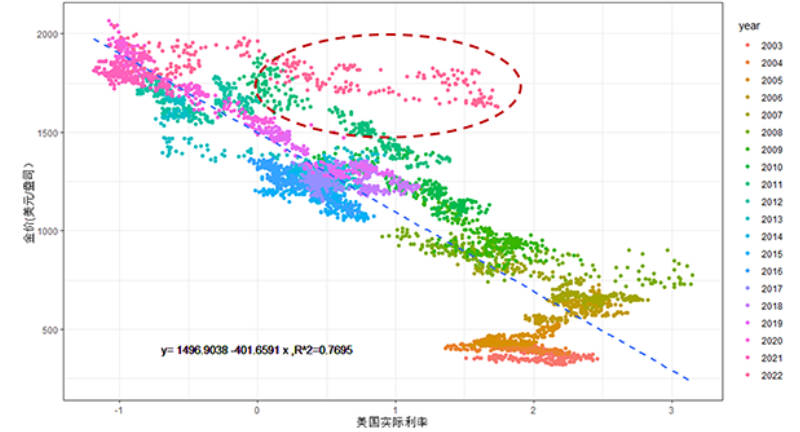 ·¶Ê½×ª±ä£¬£¬£¬½ð¼ÛËÆºõÕýÔÚÍÑÀëÏÖʵÀûÂʵÄçÖÉþ¡£¡£¡£¡£¡£ÃÀ¹úÏÖʵÀûÂÊÒ»Ö±±»ÊÓΪ½ð¼ÛµÄ¾µÏñÖ¸±ê£¬£¬£¬ÈôÊÇÎÒÃǰÑ2003ÄêÒÔÀ´ÃÀ¹ú10ÄêÆÚÏÖʵÀûÂʺͽð¼Û×öÏßÐԻع飬£¬£¬Á½Õß¼äÓкÜÊÇÏÔÖøµÄ¸ºÏà¹Ø¹ØÏµ¡£¡£¡£¡£¡£µ«2022ÄêÒÔÀ´½ð¼ÛºÍÃÀ¹úÏÖʵÀûÂʵĸºÏà¹Ø¹ØÏµ±£´æÐ©Ðíת±ä£¬£¬£¬Æ«Ïòû±ä£¬£¬£¬Ð±ÂʱäÁË£¬£¬£¬Ãô¸ÐÐÔ±äÁË¡£¡£¡£¡£¡£¼òÆÓ¶øÑÔ£¬£¬£¬ÔÚ2022ÄêÃÀ¹úÏÖʵÀûÂÊÉÏÐеÄÀú³ÌÖУ¬£¬£¬½ð¼Û¼«Îª¿¹µø£¬£¬£¬¶ÔÏÖʵÀûÂʵÄÉÏÐиü¶Û»¯£¬£¬£¬ÏÂÐиüÃô¸Ð£¬£¬£¬ÕâÒ»Õ÷ÏóÔÚÖнð¹«Ë¾ºÍĦ¸ùÊ¿µ¤ÀûµÄ±¨¸æÖоùÓÐÌá¼°£¬£¬£¬¸÷¹úÑëÐеĹº½ð³±»òÐíÊǽð¼Û±¾ÂÖ·¶Ê½×ª±äµÄÒªº¦ÒòËØ¡£¡£¡£¡£¡£