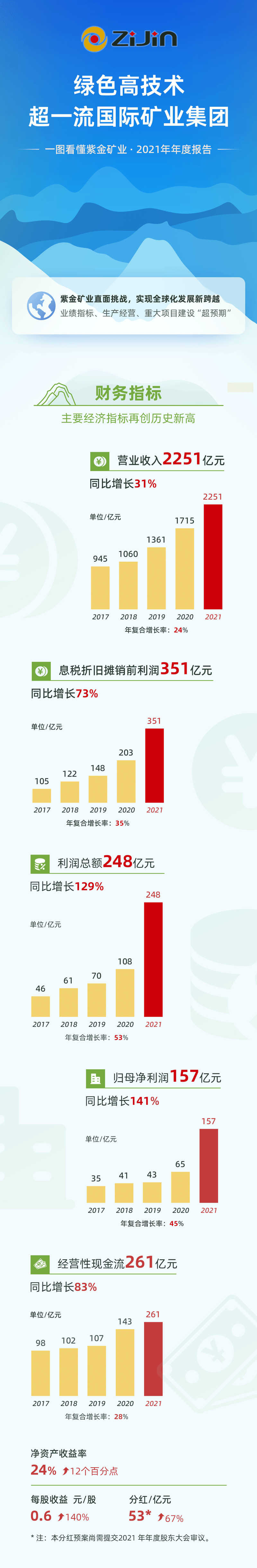 ±¾ÍøÑ¶ 3ÔÂ18ÈÕÍí¼ä£¬£¬6165cc½ðɳ×ÜÕ¾¿óÒµÐû²¼2021ÄêÄê¶È±¨¸æ£¬£¬¹«Ë¾Ä±»®Ö¸±ê¿çÔ½ÔöÌí£¬£¬´´Àúʷиߣ¬£¬ÓªÊÕºÍ×ʲú×ܶîË«Ë«Í»ÆÆ2000ÒÚÔª´ó¹Ø£¬£¬ÕûÄêϢ˰ÕÛ¾É̯ÏúǰÀûÈó351ÒÚÔª£¬£¬ÀûÈó×ܶî248ÒÚÔª£¬£¬¹éÊôĸ¹«Ë¾¾»ÀûÈó157ÒÚÔª¡¢Í¬±ÈÔöÌí141%£¬£¬Ä±»®ÐÔ¾»ÏÖ½ðÁ÷ʵÏÖ261ÒÚÔª¡£¡£¹«Ë¾Äâ¼ÌÐø¼á³Ö¸ß·Öºì±ÈÀý£¬£¬Æ¾Ö¤Ã¿10¹ÉÅÉ·¢Ã÷½ðÓ¯Àû2Ôª£¬£¬·ÖºìÔ¤°¸Ô¼53ÒÚÔª¡¢Í¬±È´óÔö67%¡£¡£